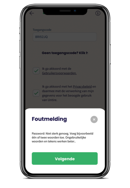 We geven Untire daarom het advies om aan de gebruiker duidelijk te maken wat er van hem/haar verwacht wordt. Voeg bijvoorbeeld toe: Je wachtwoord moet een cijfer, hoofdletter en leesteken bevatten en minimaal 8 tekens lang zijn. Idealiter werkt dit ook nog met vinkjes: zodra aan een van de voorwaarden wordt voldaan, wordt deze groen. Op die manier weet de gebruiker precies wat hij/zij nog moet aanpassen en ook wanneer het wachtwoord veilig genoeg is om door te gaan.