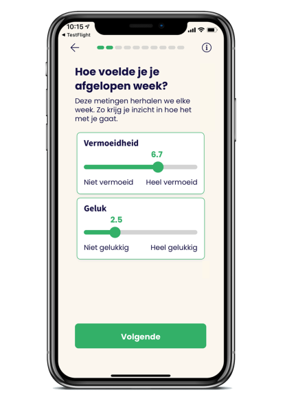 Bijvoorbeeld ook het invullen van hoe de gebruiker zich vandaag voelt. Gebruikers begonnen erop te klikken, en hadden daarnaast ook de neiging naar een rond getal te willen slepen. Ook is deze vraag makkelijker gesteld dan beantwoord: voor veel gebruikers is het lastig aan te geven hoe gelukkig zij zijn, bijvoorbeeld omdat zij zich zonder de ziekte heel anders hadden gevoeld. Door de sliders te vergemakkelijken, kunnen we een deel van de frustratie wegnemen en het aanmeldproces weer net een stapje makkelijker maken.
