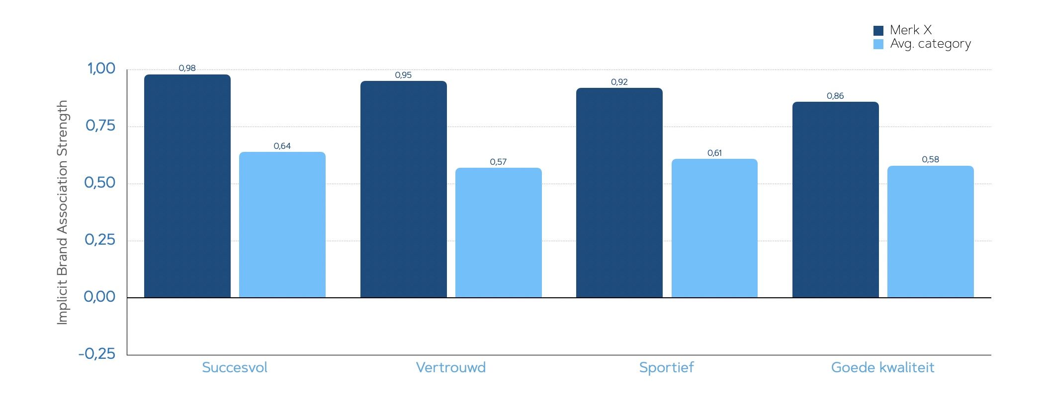 Hieronder vind je outputvoorbeelden van Merkimago Onderzoek op basis van de Implicit Association Test (IAT).