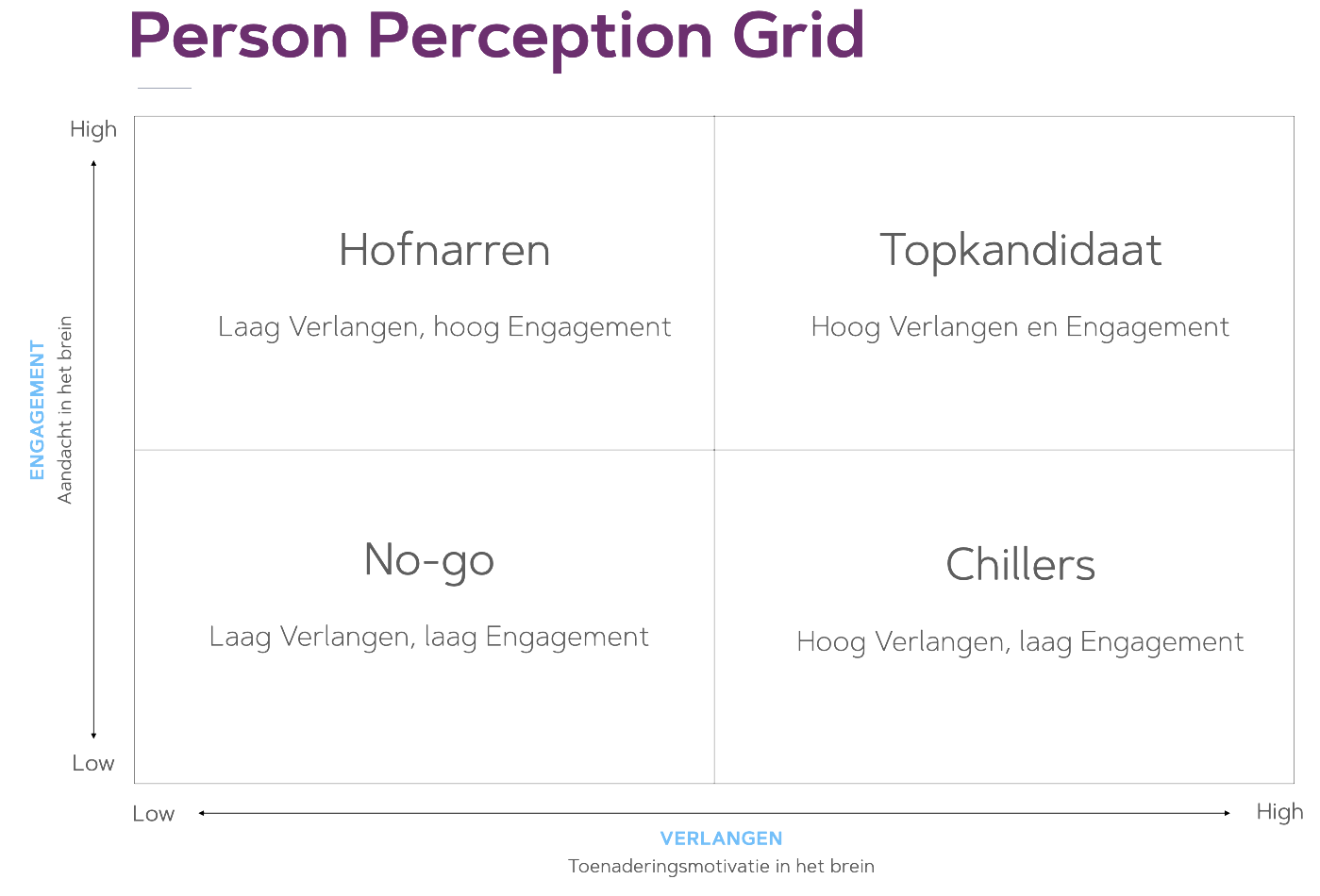 Per kandidaat berekenen we de gemiddelde score op Verlangen en Engagement. Deze verwerken we tot het Person Perception Grid, waarin je in één oogopslag de performance van elke kandidaat ziet.